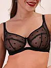 Модель із м’якою чашкою на каркасах виконана в елегантному поєднанні чорного та нюдового кольорів, а делікатний візерунок у горошок додає особливого шарму. Бюстгальтер формує привабливе декольте, даруючи підтримку та комфорт на цілий день. Регульовані не відстібні бретелі та класична застібка на спині забезпечують зручну посадку.