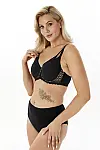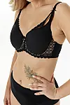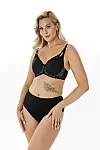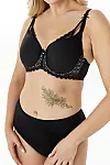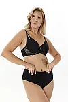 Декоративна мереживна деталь у верхній частині чашки додає витонченості та підкреслює жіночність образу. Широкі бокові частини з вертикальними каркасами забезпечують м’яку, але стабільну підтримку грудей, рівномірно розподіляючи навантаження. Формостійке полотно допомагає зберігати красиву форму бюста та сприяє комфортному мікроклімату для шкіри протягом усього дня.