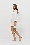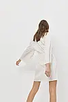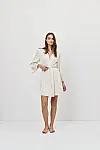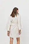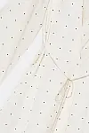 Легка та блискуча тканина зі суміші віскози та поліестеру з шовковисто-м’якою текстурою. Колір — витончений кремовий із делікатним чорним принтом у горошок. Модель виконана у жіночному силуеті з V-подібним вирізом та розкльошеними рукавами.